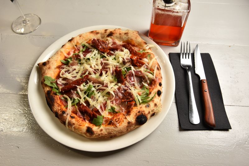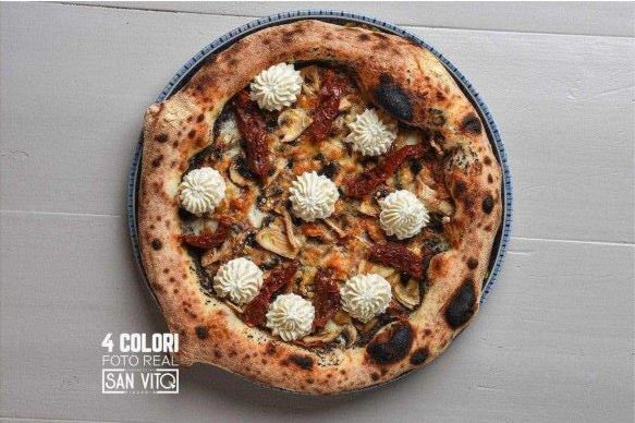 Tartufo nero, fior di latte, mushrooms, alpine pancetta, artichoke (in season), ricotta and dried tomato.