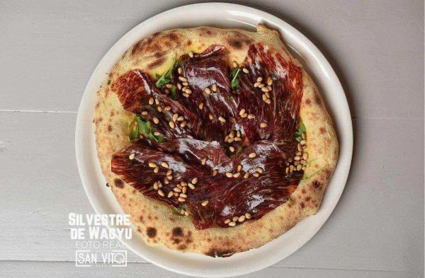 Base de pizza con micuit y grana padano DOP, rúcula, cecina de Wagyu y piñones tostados.