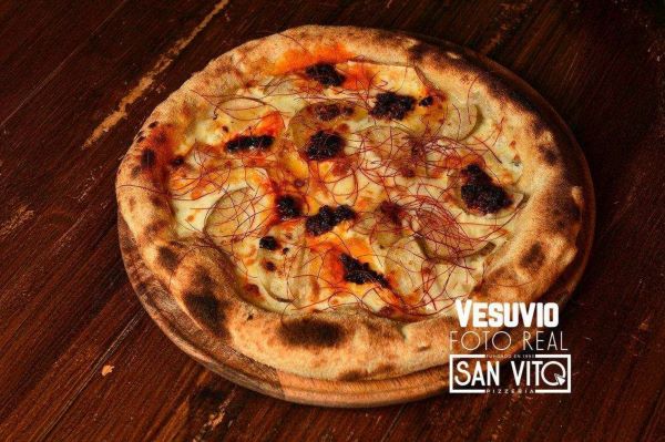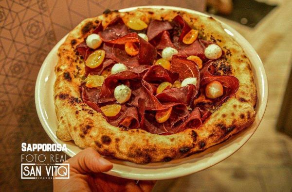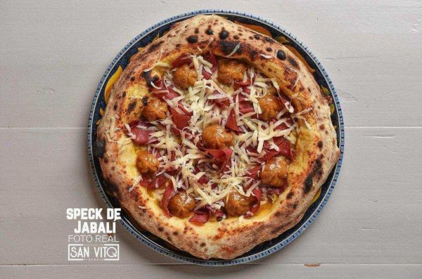 Base de pesto, fior di latte, jamón de ciervo ahumado, pomodori semidry gialli y mozzarella de búfala.