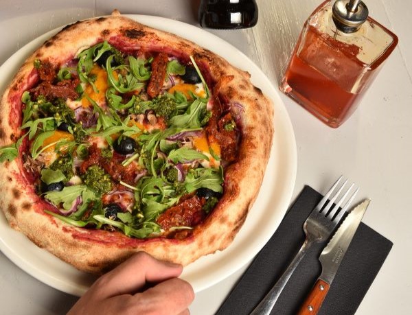Beetroot hummus base, fior di latte, (vegan cheese option) mushrooms, onion, pumpkin, black olives,